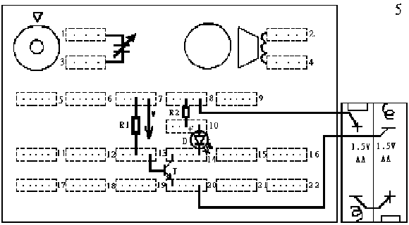 按接线图表5接好电路,注意三极管e、b、c三个管脚及发光二极管的极性不要接错。R1是基极的偏置电阻,当用红线(W)接到14号弹簧或8号弹簧时都可向基极加上偏置电流使三极管导通,(即c、e极间相当于短路),发光二极管D导通发光。当红线(W)接到20号弹簧时,由于20号弹簧的电位低,三极管不导通(即c、e间相当于断路)发光二极管D不发光。